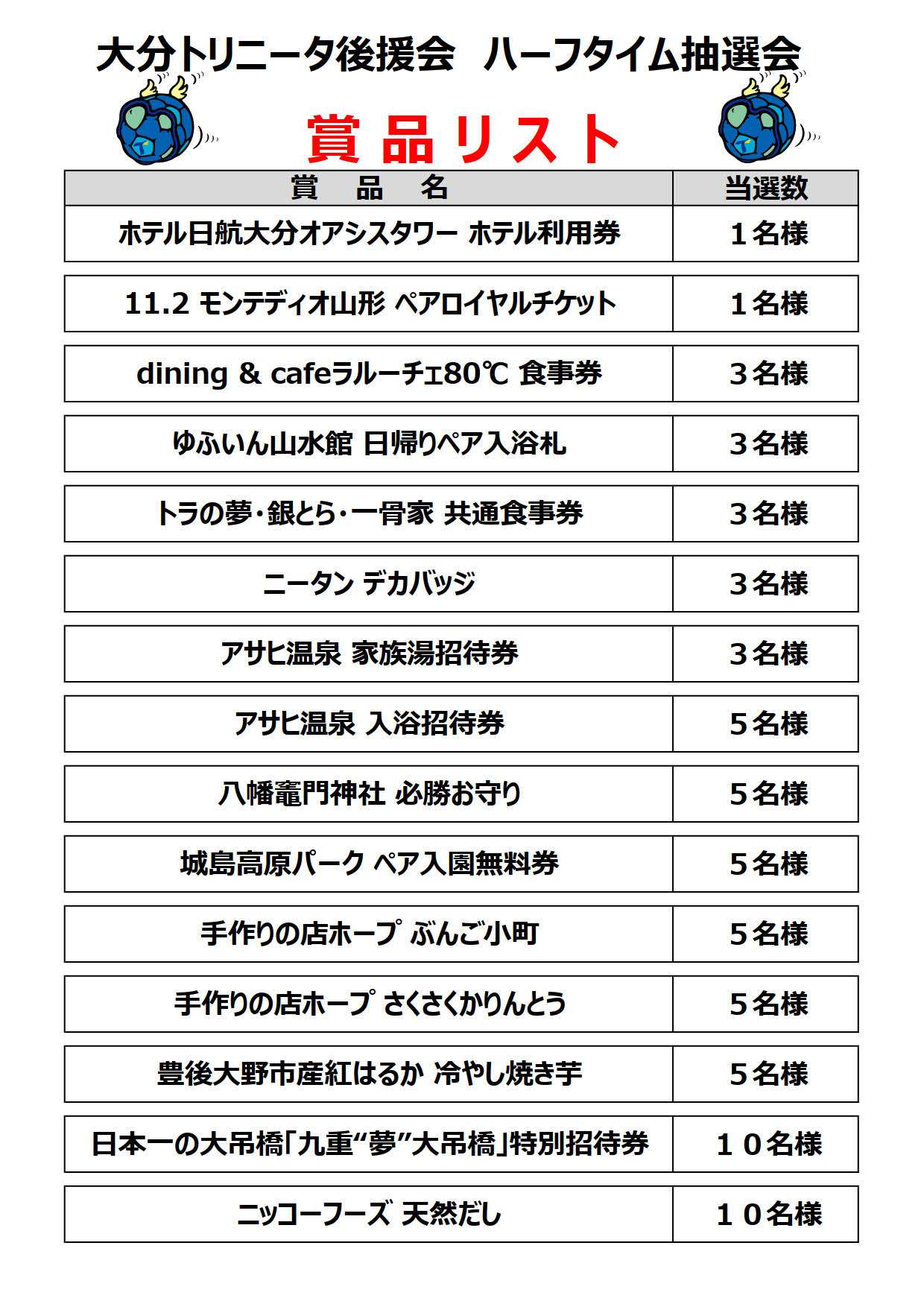 日頃より大分トリニータ後援会にご支援を賜り誠にありがとうございます。 9/27(土)愛媛FC戦ハーフタイム抽選会賞品リストです。 キックオフ(試合開始)15分前【18:45】までに 北口ゴール裏の【後援会ブース】へ応募券をご投函ください。 【賞品引換に関する注意事項】 賞品の引換は試合終了後10分以内とさせていただきます。 時間を過ぎると無効となってしまいますので、くれぐれもご注意ください!
